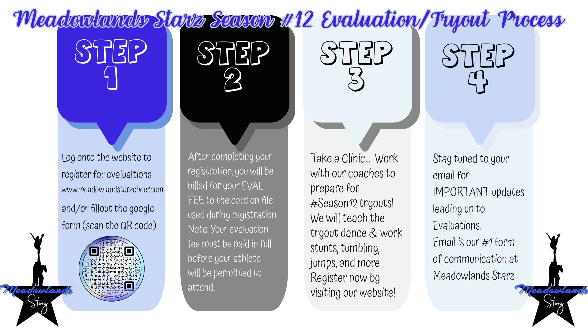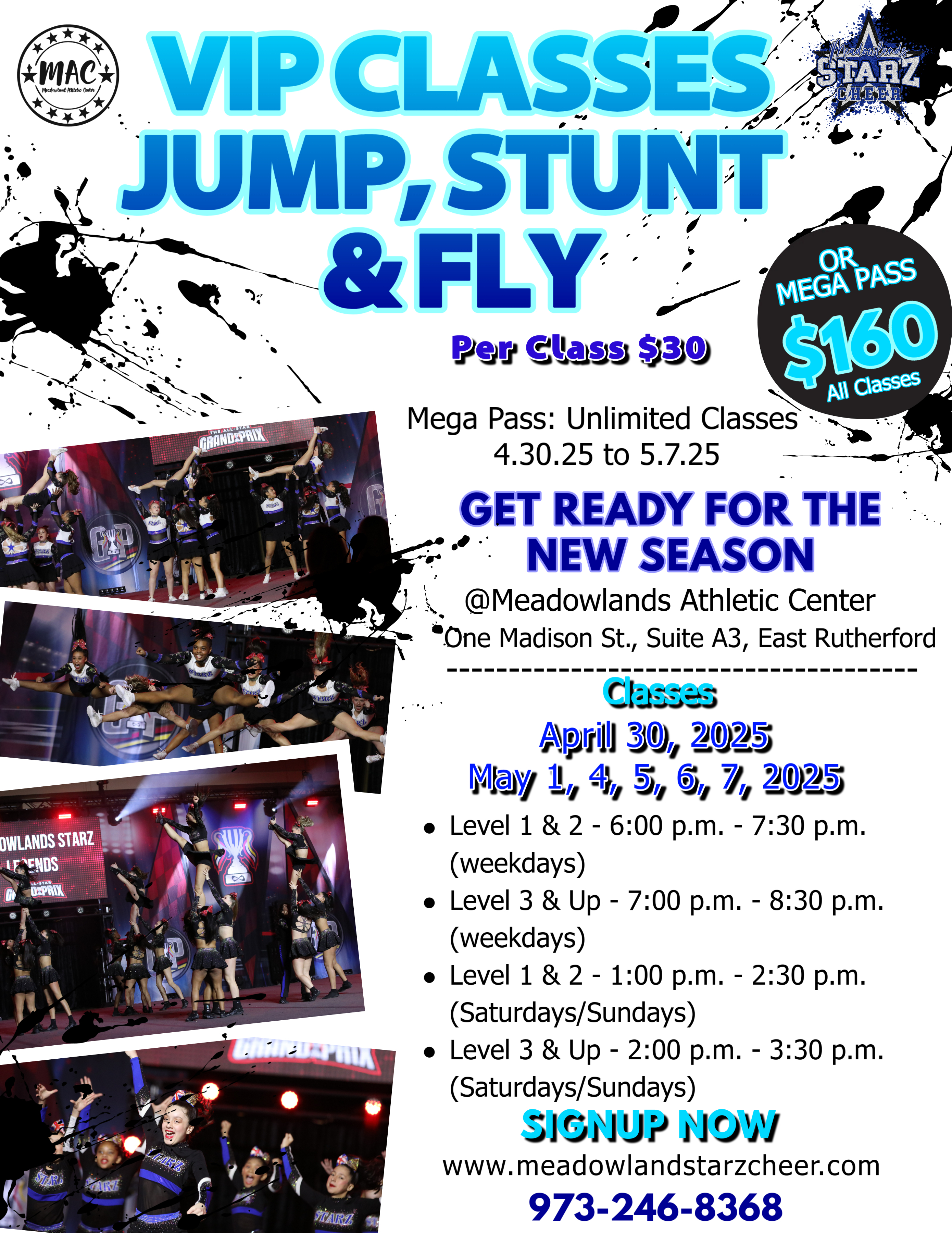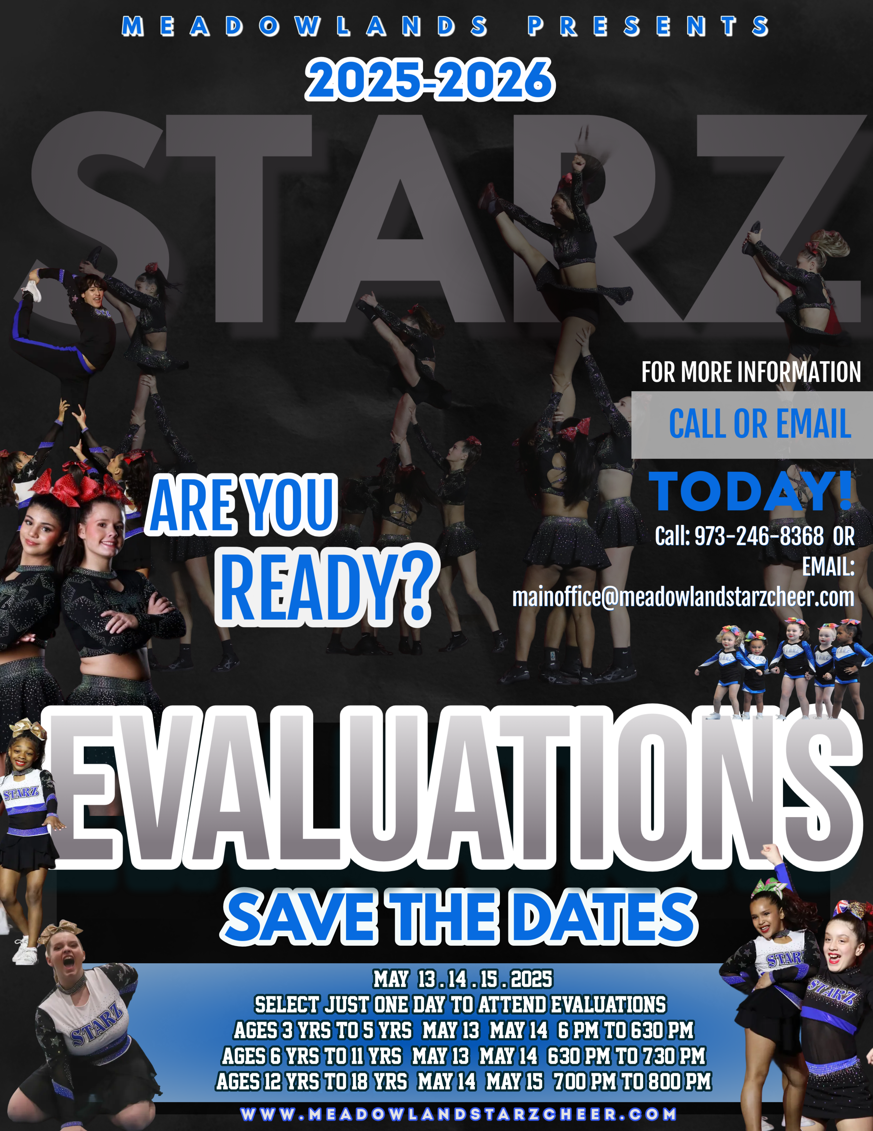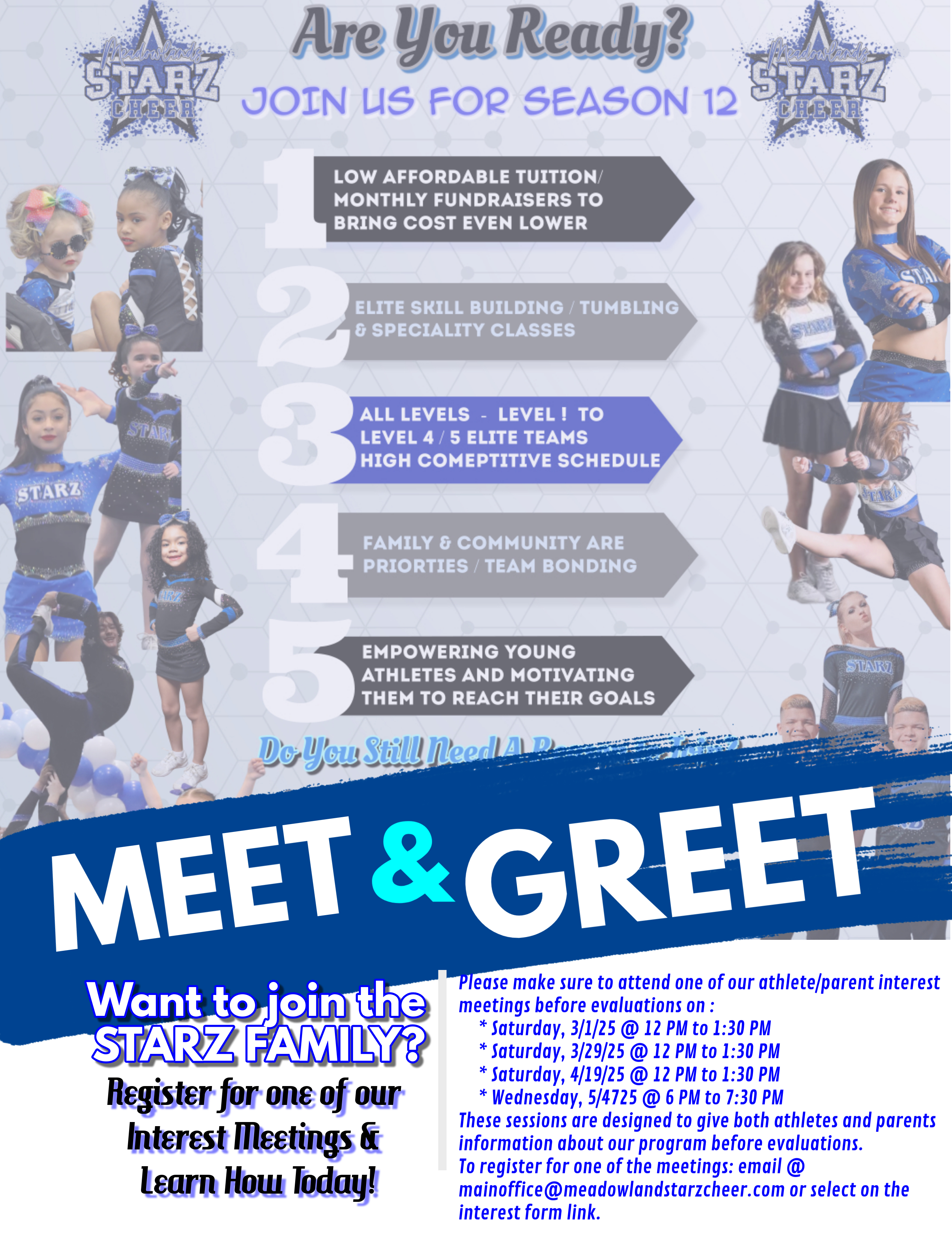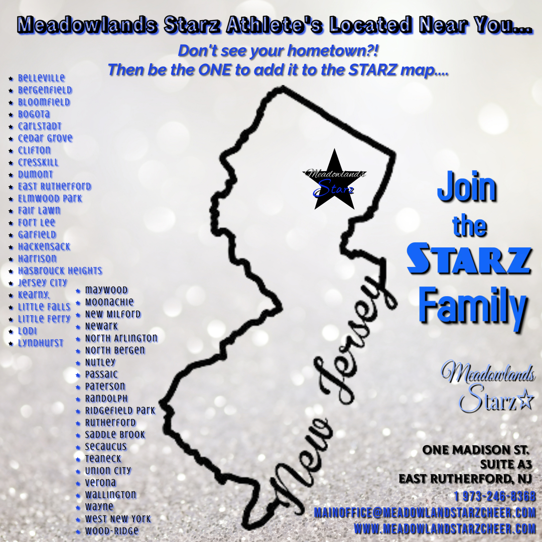 Thank you so much for your interest in MEADOWLANDS Starz CHEER! If you would like to cheer for a Meadowlands Starz team, please complete this form so we can get to know you better and add you to all the important information for the upcoming interest meeting and tryout/evaluation process for the NEW 2025-2026 Season.